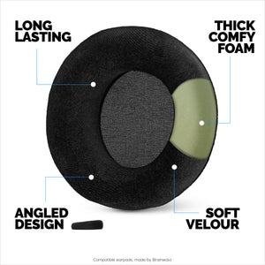 Disse er kompatible ørepuder, fremstillet af Brainwavz. Fremstillet med superblødt velourstof, viklet rundt om skumpolstring af den bedste kvalitet, hvilket bringer udseendet, følelsen og lydkvaliteten tilbage til dit headset.